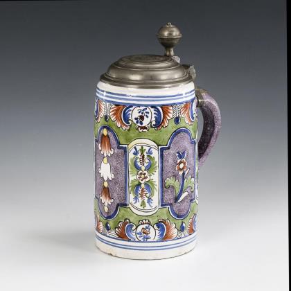 Thuringian faience roller jug with cartouche decor.