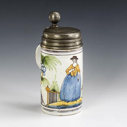Baroque faience roller jug with lady in landscape.
