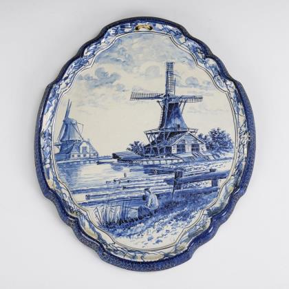 Oval faience mural with Delft windmill motif. Tichelaar Brothers, Makkum.