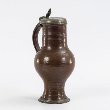 Brown stoneware jug with pewter lid.