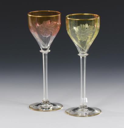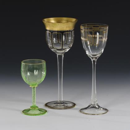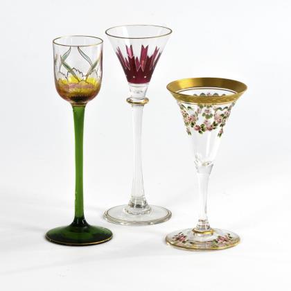 1x Likörglas um 1902, Form "1528", Dekor "1723/3": Kuppa aus farblosem Glas mit floraler, goldkonturierter Malerei in Transparentemail, Stängel und Rundfuß aus dunkelgrünem Glas (H 14,5 cm). / 1x seltenes Likörglas um 1907, Form "1757", Dekor "1869": konische Kuppa, Stängel und Rundfuß aus farblosem Glas, auf der Kuppa ein geometrisches Muster aus rotem Transparentemail und weißem Opakemail, Goldstaffage (H 14 cm). / 1x Likörglas um 1920, Form "175": längsoptisch geblasene, in den Schaft übergehende Kraterkuppa, Rundfuß, auf Kuppa und Fuß polychrom emailgemalte Rosenfestons, Goldstaffage mit teils geätzter Lorbeerranke (H 11,5 cm)