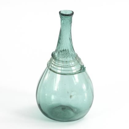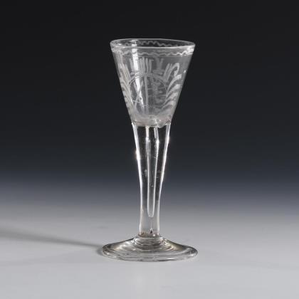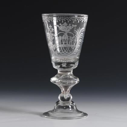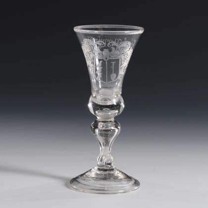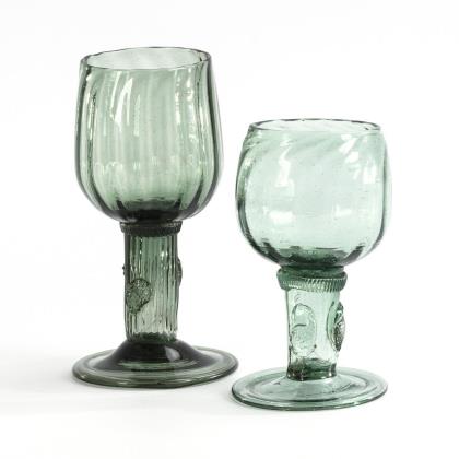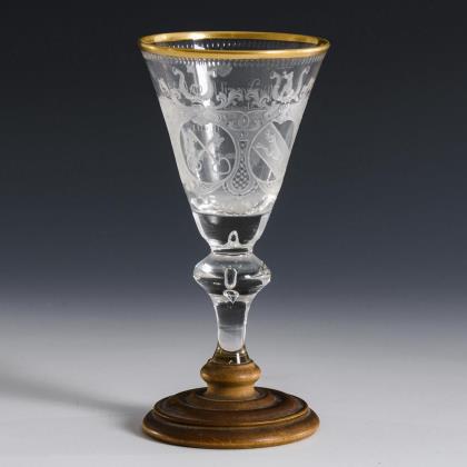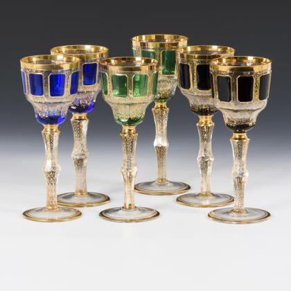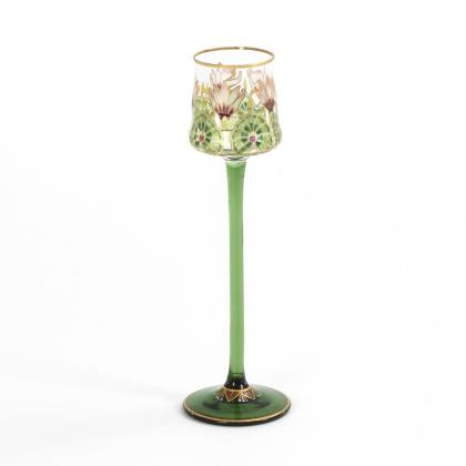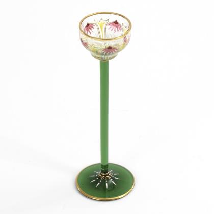 Glockenförmige, längsoptisch geblasene Kuppa aus farblosem Glas, Stängel und Rundfuß aus grünem Glas. Umlaufend ein polychrom gemaltes, stilisiertes und fünffach rapportierendes Floraldekor in Transparentemail mit goldenen Konturzeichnungen und Goldrand