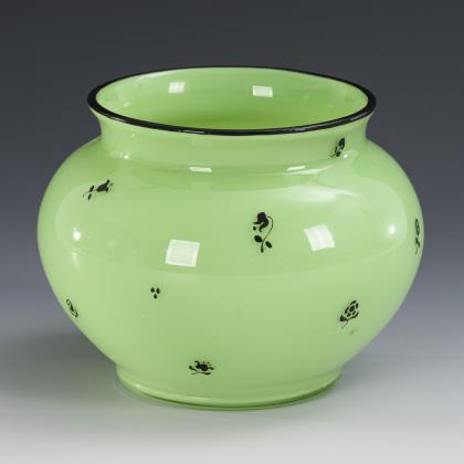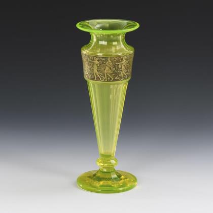 Längsoptisch geblasene Kuppa aus farblosem Glas, Stängel und Rundfuß aus grünem Glas. Umlaufend ein polychrom gemaltes, fünffach rapportierendes Alpenveilchendekor in Tranparent- und Opakemail mit Konturzeichnungen in Gold