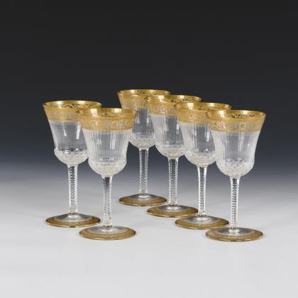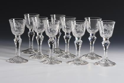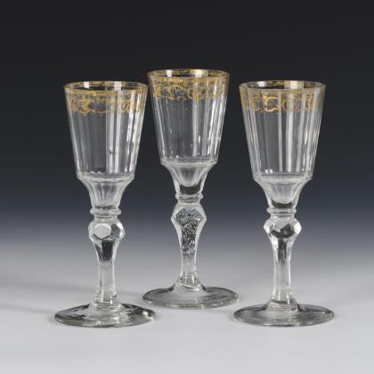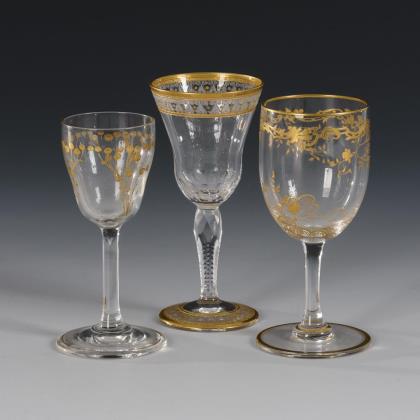 1x Likörglas "Thistle", St. Louis, um 1920: längsoptische Kuppa mit Olivenschliffkranz, facettierter Schaft mit gezänkelten Kanten, Rundfuß; mit geätzter, ornamentaler Bordüre und Goldstaffage (H 9,5 cm). / 1x Josephinenhütte: Glockenkuppa aus farblosem Glas mit geätztem und goldstaffiertem Rocaille- und Floraldekor (H 9,5 cm). / 1x Likörglas, Entwurf Carl Lederle für die Gräflich Harrachsche Hütte: Glockenkuppa aus farblosem Glas mit goldgemaltem, stilisierten Floraldekor (H 9 cm)