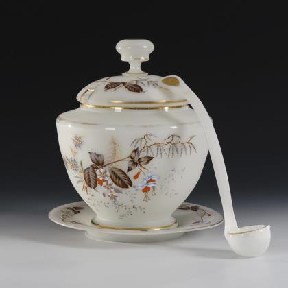 Alabaster glass punch bowl with presentoir and ladle. Rain lodge.