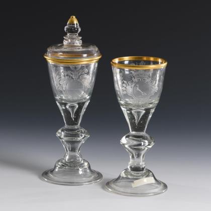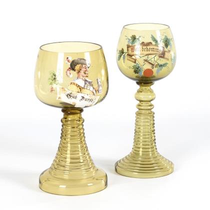 1x Theresienthal, "Römer 1751 mit Dekor 1863/2": halbovoide Kuppa mit geometrischem Dekor in Gold sowie rotem, weißem und grünem Opakemail (H 22 cm). / 1x Josephinenhütte, um 1912: Glockenkuppa mit schwarzemailgemalten Kartuschen in Facettenoptik, Goldstaffage (H 22,5 cm). / 1x Lobmeyr, um 1900, signiert: grünes Uranglas, längsoptische Kuppa, gedrehter Schaft und längsoptischem Rundfuß, Goldstaffage (H 13 cm)