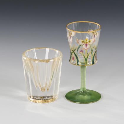 1x seltenes Likörglas Josephinenhütte, um 1900: Glockenkuppa aus farblosem Glas mit goldkonturiertem und stilisiertem Irisdekor in transluzider Transparentemailmalerei, grün staffierter Stängel und Rundfuß (H 10 cm). / 1x Lobmeyr?: 12-fach facettierter, konischer Becher mit emailgemalter und sich 2-fach spiegelnder Gänseblümchenblüte auf dem Zwischengoldboden (H 6,5 cm)
