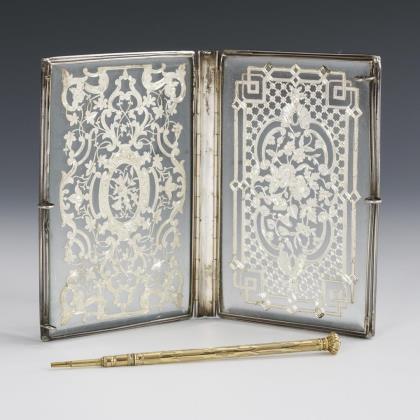 Extremely finely crafted notepad case with intermediate silver; accompanied by a silver pen.