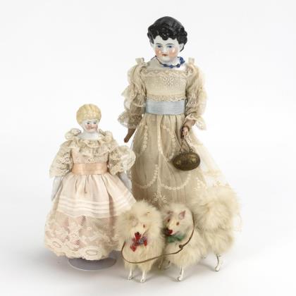 2 small porcelain head dolls and dog.