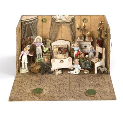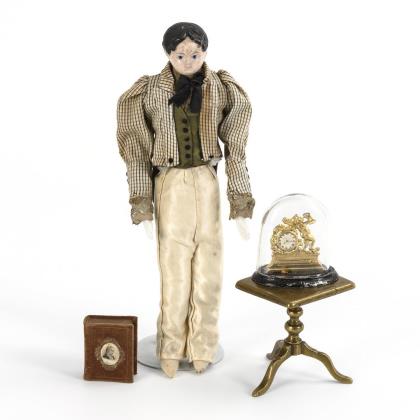 Late Biedermeier dollhouse gentleman with folding table, miniature clock and book.