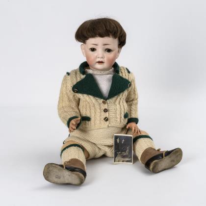 Kurbelkopf, braune Schlafaugen, Wimpern, jünger ergänzte braune Echthaarperücke. 7-teiliger Sitzbabykörper mit beweglichen Celluloidhänden. Weiß-grüne Strickkleidung, schwarz-braune Kinderschuhe. Dazu kleines Foto der Puppe aus den 1920er/30er Jahren
