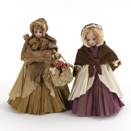 2 small porcelain head dolls with paper clothes.