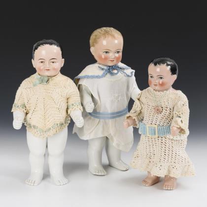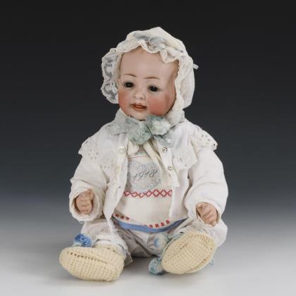 Kurbelkopf, braune Schlafaugen, offen/geschlossener Mund, gestrichelte Babyhaare. 5-teiliger Sitzbabykörper. Weiße Kleidung, Häubchen und Häkelschuhe. Dazu alte Kinderrassel. Kopf ohne sichtbare Defekte, lediglich kaum sichtbare Brandrisse hinter den Ohren.