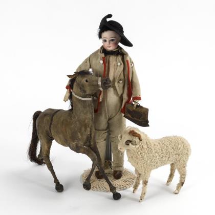 Petite porcelain head doll with horse and sheep.