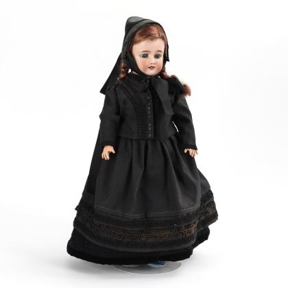 Porcelain head doll in black traditional costume. Schoenau & Hoffmeister.