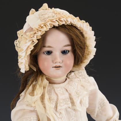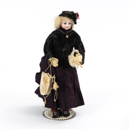 Porcelain head girl with fur coat. Baehr & Proeschild.