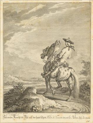 RIDINGER, Johann Elias (1698 Ulm - 1767 Augsburg). "Falconierknecht leading the eagle owl on the hand".