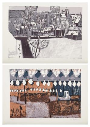 HUSEMANN, Erich (1928 Friedberg - 2008 Trappstadt). 2 works: "Dorf im Winter" and "Stockfischhafen".