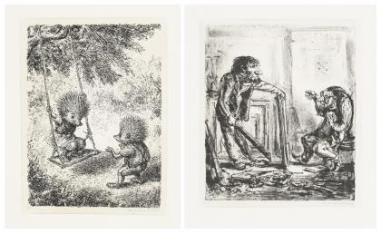 WEBER, Andreas Paul (1893 Arnstadt - 1980 Schretstaken). 2 works: "Schaukelnde Igelkinder" and "Geteilter Meinung".