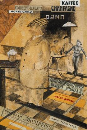 Interieur-Darstellung mit verschiedenen aufgeklebten Elementen. Eine typische alltägliche Genreszene, gekoppelt mit einem verführerischen Revue-Girl. Kyrillisch und lateinisch bezeichnet. Neuwertiger verglaster Rahmen