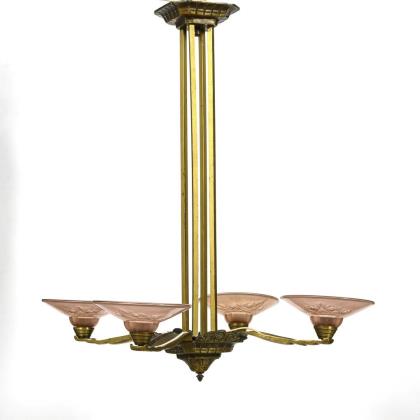 6-flammige Hängelampe an Mittelstrebe mit Rosettenbaldachin, balusterförmige Halterung mit 5 Karyatiden-Armen mit Lampenschirmen aus satiniertem Pressglas in stilisierter Zapfenform sowie zentralem Lampenschirm. Alters-/Gebrauchsspuren, Glasränder teils mit Chips.
