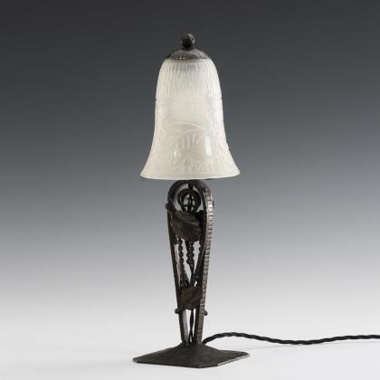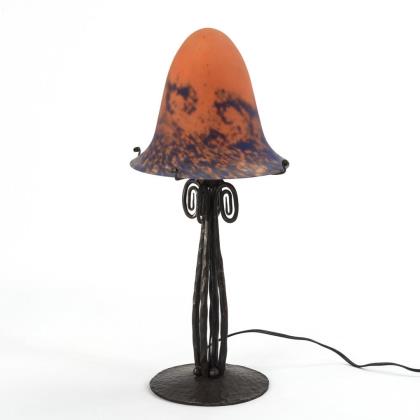 Schmiedeeiserne Füßße mit Blattverzierungen, farbloser Glockenschrim mit floral-abstraktem Dekor
