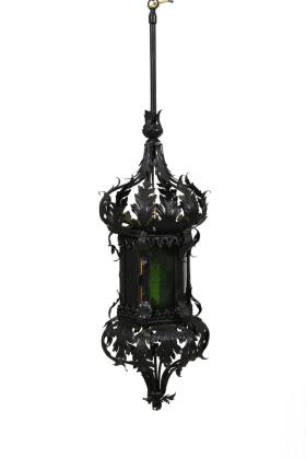 Schmiedeeisern, scharz lackiert, mit dunkelroten Glasscheiben, elektrifiziert