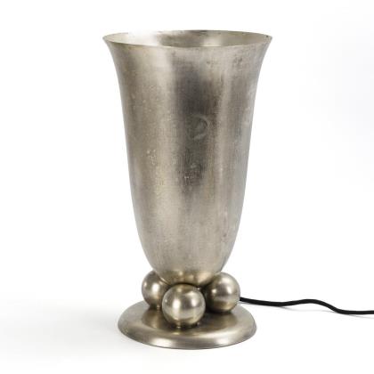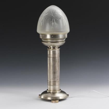 Round base with 3 disc feet, shaft as a round pillar with grooved decoration, stepped support for the mushroom-shaped shade with a circumferential cross cut