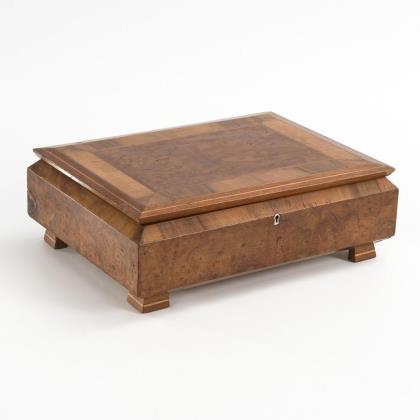 Also usable as a sewing box, flat casket with slightly conical legs and beveled body; mock cassette marked on the hinged lid. Inside removable compartment and red fabric cover in the lid and on the bottom.