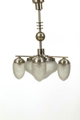 6-light hanging lamp on central strut with rosette canopy, baluster-shaped fixture with 5 caryatid arms with lampshades made of satin pressed glass in stylized cone shape and central lampshade