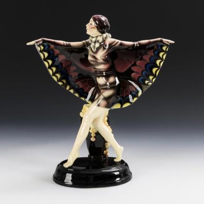 . Braune Stempelmarke, 1926/32-1953. Ohne Modell-Nr. (1385). Entwurf von Max Daniel Hermann Fritz, 1921, signiert. Stehende Dame im eleganten Rokokokleid, die einen Handkuss von einem Herrn empfängt. Weiß mit Goldstaffage. Kopf der Dame restauriert, min. Bestoßung am Hut des Herrn, unterseitig verfüllter Brandriss, Gold berieben. H 24,5 cm.