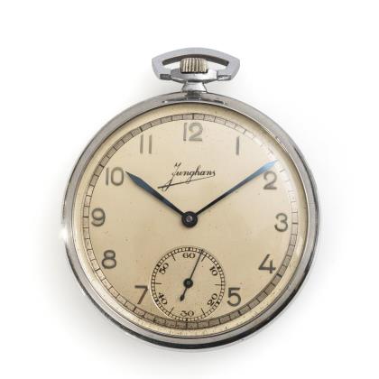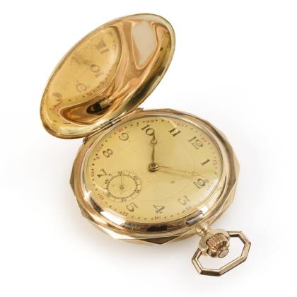 Rückseitig graviertes Monogramm JM, datiert: 1925. Handaufzug, Ankerwerk, goldfarbenes Zifferblatt, schwarze arabische Zahlen, kleine Sekunde, gebläute Stahlzeiger. Punzen: Feingehalt. Gehäuse ohne Werk gewogen: 8 Gramm