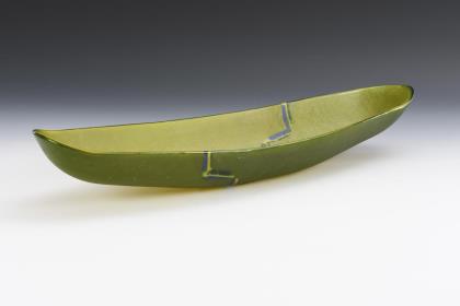 Oval frosted etched bowl of light blue bubbled glass with opal yellow inner rim and mounted strip with zigzag pattern of cobalt blue and opal yellow glass strips