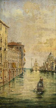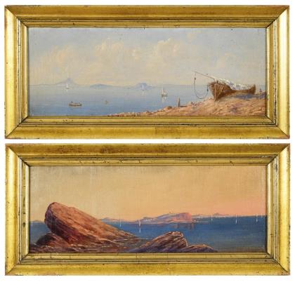 BUONO, Leon Giuseppe(1888 Neapel - 1975) Italienische Küstenlandschaft Öl/Leinwand. Links unten signiert. 30,5 x 43,5 cm. Gerahmt : 43 x 56 cm. Fischerboote auf dem ruhigen Wasser nahe dem Strand bei tief stehender Sonne.