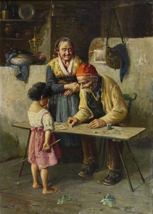 Simonetti, Alfonso: Genre scene with child and seller.