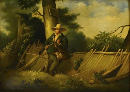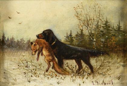 Indistinctly signed: Hunting dog with fox in winter landscape.
