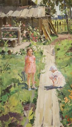 In großzügigem Pinselschlag, teils in Spachteltechnik ausgeführte, sonnendurchflutete friedliche Sommer-Idylle. Mit Bleistift kyrillisch bezeichnet. Rückseitig kyrillisch bezeichnet, kyrillischer Klebezettel. Profilrahmen mit Leinenbezug und vergoldeter Stuckleiste