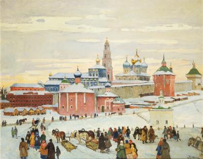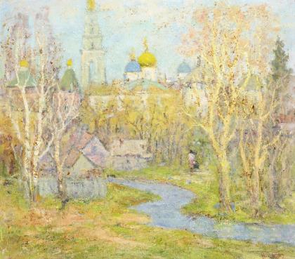 Im 18. Jahrhundert wurde die Ortschaft Possad genannt, 1930 bis 1991 in Sagorsk, seit 1992 in Sergijew Possad umbenannt. Das Kloster wurde um 1340 vom Heiligen Sergius von Radonesch gegründet und ist seit Jahrhunderten ein bedeutendes religiöses Zentrum der russisch-orthodoxen Kirche, es gehört seit 1993 zum UNESCO-Weltkulturerbe. Rückseitig auf einem Klebezettel kyrillisch bezeichnet, datiert: (19)52. Profilierter Goldrahmen