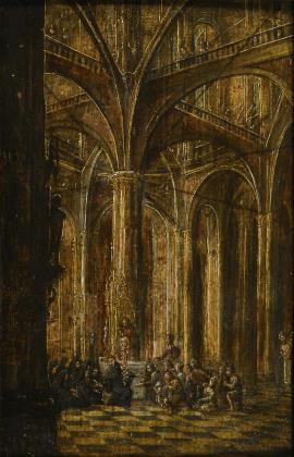 Baroque painter: Church interior with praying people.