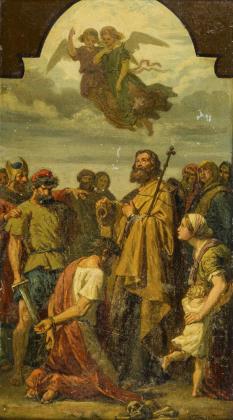 Probably design for wall or altar painting with prisoner who is baptized under the gaze of several people by a clergyman with cross staff