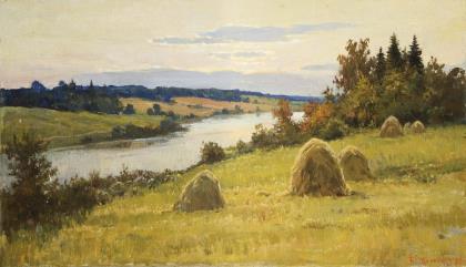 Ein bodenständiges Landschaftskonzept mit Tiefenmotiv. Die Flächen, im Vordergrung Diemen (aufgebaute Haufen Heu), sind reizvoll gegliedert. Ohne Rahmen