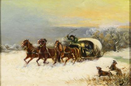Das Motiv im idyllisch-naturalistischen Stil vermittelt die Stimmung osteuropäischer Melancholie. Neuwertiger Profilrahmen mit schmaler vergoldeter Stuckleiste, weiß gefasst