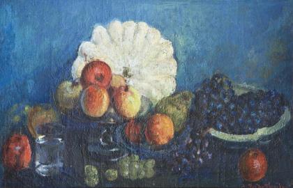 ZEITLINA, Gregorii Israiliev: Still life. Oil/painted cardboard, unsigned, verso inscribed/dated in Cyrillic: 1978. 49 x 65 cm, partly gold frame 67 x 84 cm. Fruits painted in strong colors on a plate and in a bowl next to can and jug on a table. ■ Russian artist (1911 - 2000).