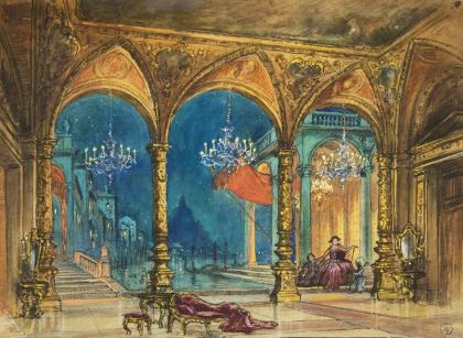 Pompöses Interieur eines venezianischen Palazzo. Überaus detailreich und fein gemalt. Dabei ein Bühnengrundriss mit Etappenplan des Teatro San Carlo in Neapel, Skizzen und Notizen des Künstlers, alle Blätter mit Monogramm-Stempel. Passepartout, verglaster Rahmen mit vergoldeter Stuckleiste und neuwertiger verglaster Rahmen