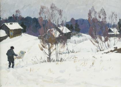 ULJANOV, Nikolai (Ульянов, Николай)(1922 Poluchkino/Kalinin - 1990) Winterlandschaft Öl/Malkarton. Unsigniert, verso bezeichnet. 38 x 54 cm. Gerahmt : 57 x 72 cm. Der Maler mit Staffelei im Schnee nahe den Dorfhäusern. Minimale Altersspuren. Russischer Maler, studierte im Stadtkunstatelier in Moskau.