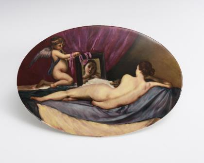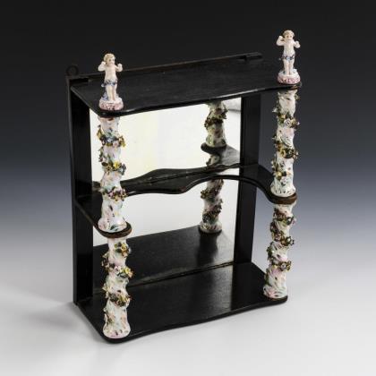 Small shelf with mirrored back wall, porcelain columns with flower covering and two small putti