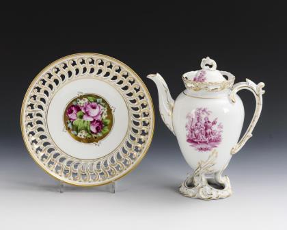 Coffee pot with rocaille foot, handle and knob lid: purple Watteau painting on the front / Credenza plate with a bouquet of roses in the mirror
