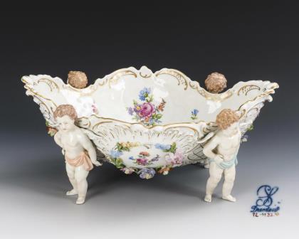 Four-passage oval bowl supported by four putti with floral coating and floral painting