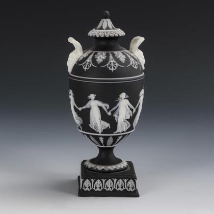 Lidded vases with ovoid platted body, two animal head handles, knobbed lid and oval foot, on oval plinth with four ball feet