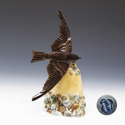 Modell von Carl Vezerfi-Clemm 1985, farbig bemalt. Rückseitig reliefierte Schriftzüge: Uferschwalben brüten in Gruben der bayrischen Sand- und Kies-Industrie. Unglasierter Boden, Bodenmarke mit A für Herzog Albrecht von Bayern, Pressmarken, am Sockel Künstler-Signet, im Original-Karton
